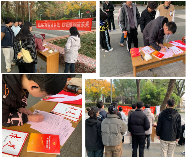 倡议活动的高潮是现场签署《诚信考试承诺书》环节。在支部党员的精心组织下,同学们积极响应,郑重地在承诺书上签下自己的名字。一笔一划,不仅是简单的签名,更是一份对个人品格的庄严承诺,一份对学术规范的坚定守护,一份对公平竞争环境的自觉维护。活动现场气氛庄重而热烈,展现了同学们坚守诚信底线的决心。